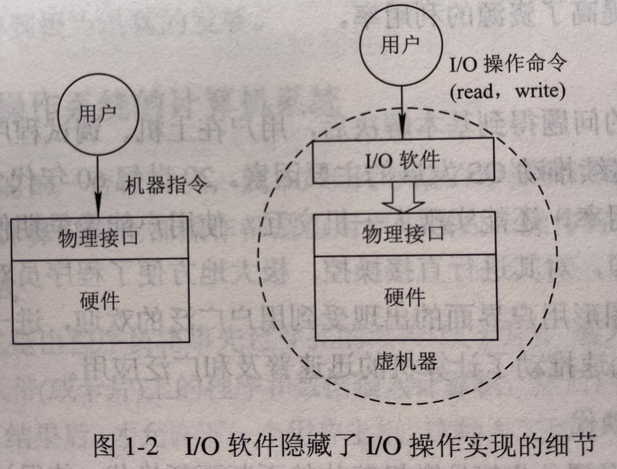 2. 扩充机器/虚机器:仅覆盖IO软件的裸机。在没有操作系统之前,裸机为了实现IO,会在裸机上覆盖一层专用IO软件,IO软件的作用是把硬件抽象成数据结构和命令,用户于是通过这批IO软件中的read和write命令去间接实现向裸机IO